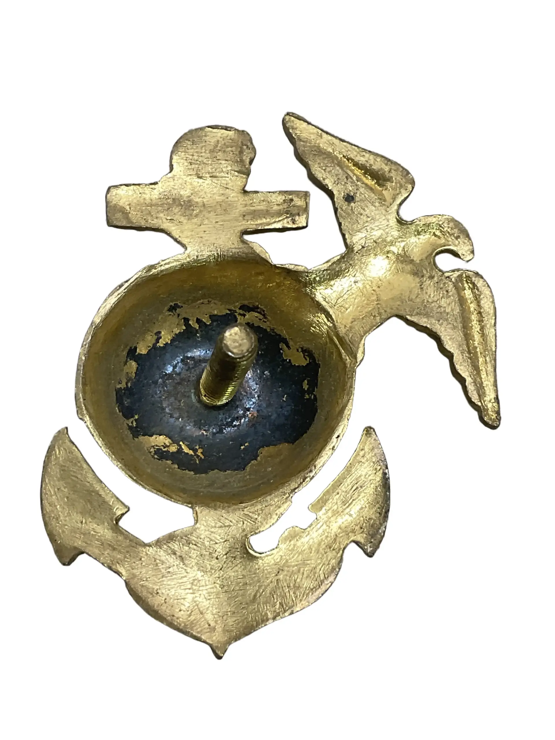 The WW2 US USMC Marine Corps Cap Badge is a military insignia issued to members of the United States Marine Corps during the Second World War. This badge was typically worn on the service cap and is distinguished by the classic Eagle, Globe, and Anchor design, representing the Marine Corps’ values and global presence. Constructed from stamped brass, the badge measures approximately 1.5 inches (38 mm) in height and features a dark bronze finish, which was standard for USMC cap badges of the era. The reverse side includes two fastening prongs or a screw-back mechanism for secure attachment to the cap. These badges were a key element of the Marine uniform and served as a symbol of identity and service. The design has remained largely unchanged in subsequent decades, making the WW2 version a recognizable and significant artifact related to Marine Corps history and World War II military uniforms.