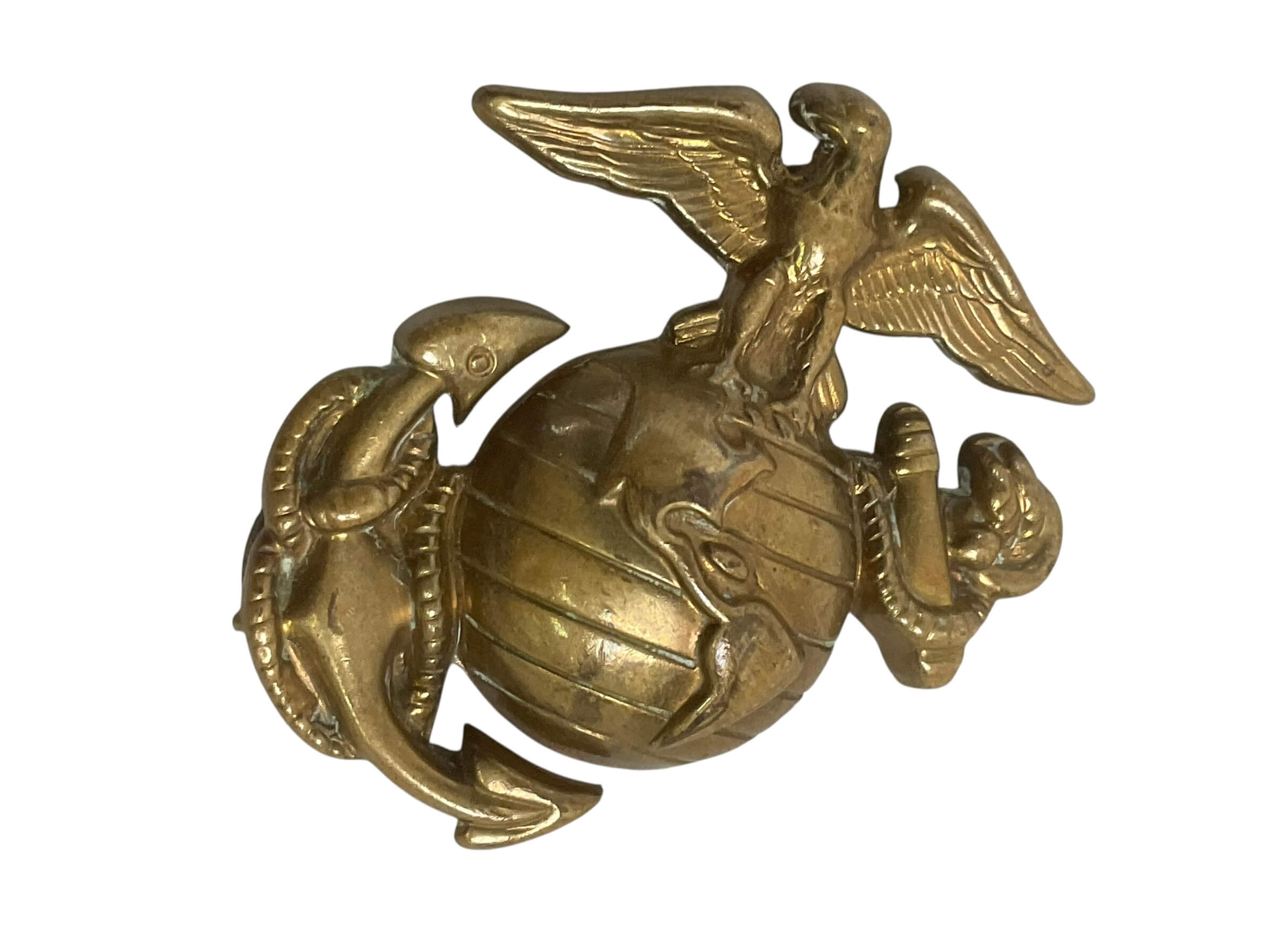 The WW2 US USMC Screw Back EGA Cap Lemon Squeezer Badge Insignia is a cap emblem used by the United States Marine Corps during the Second World War. The insignia features the traditional Eagle, Globe, and Anchor (EGA) design, representing the Marine Corps’ global reach and naval traditions. This version is specifically designed for wear on the “lemon squeezer” style service cap, which was a standard part of the USMC uniform during the 1930s and early 1940s. The badge is fitted with a screw back attachment, allowing for secure placement on uniform headgear. Constructed typically from brass or a similar alloy, these insignia were issued to enlisted personnel and officers alike. The careful detailing of the EGA motif reflects the period’s military insignia standards. This piece serves as a representative example of USMC uniforms and insignia from the era of World War II.