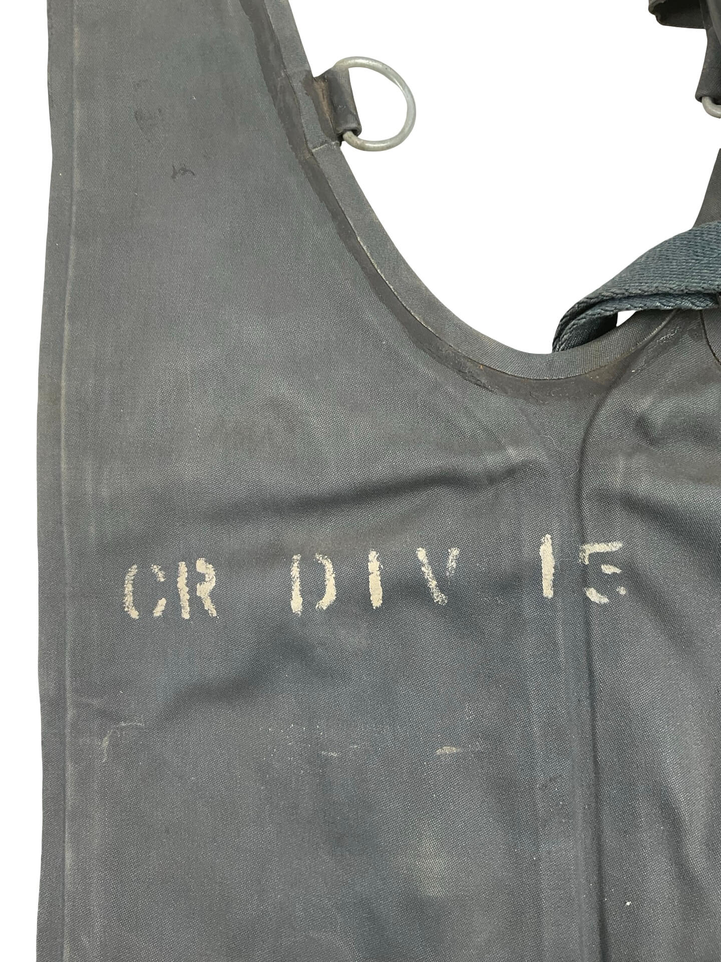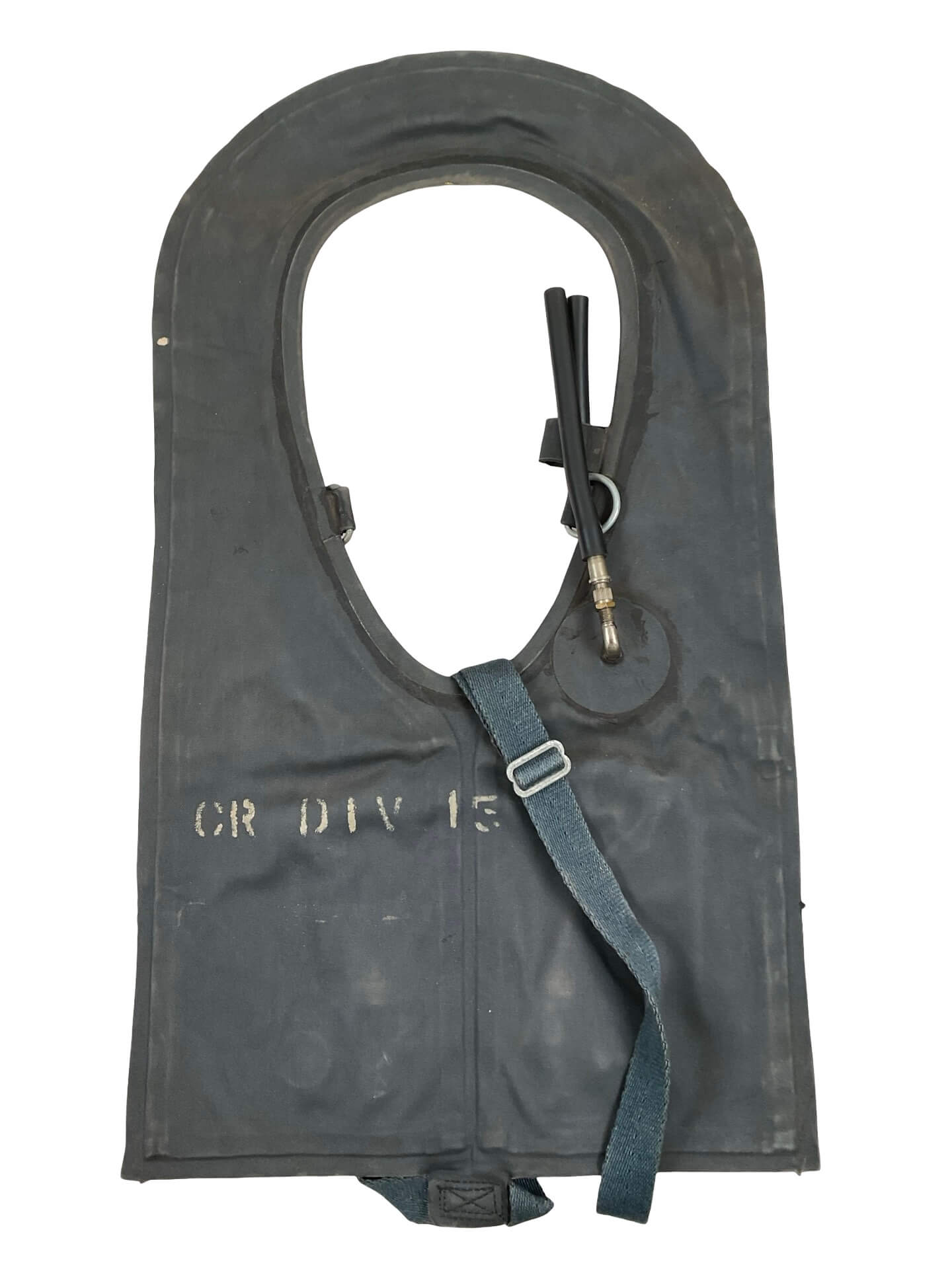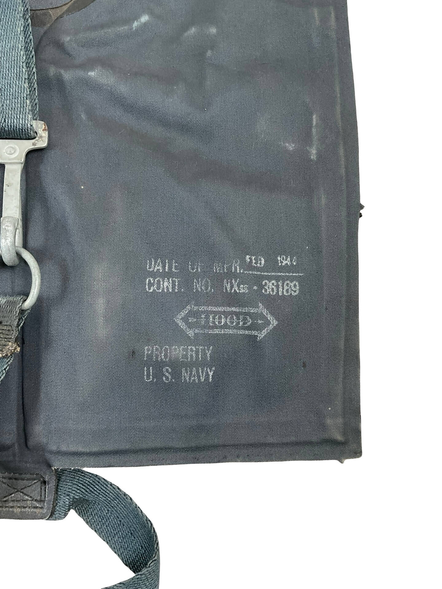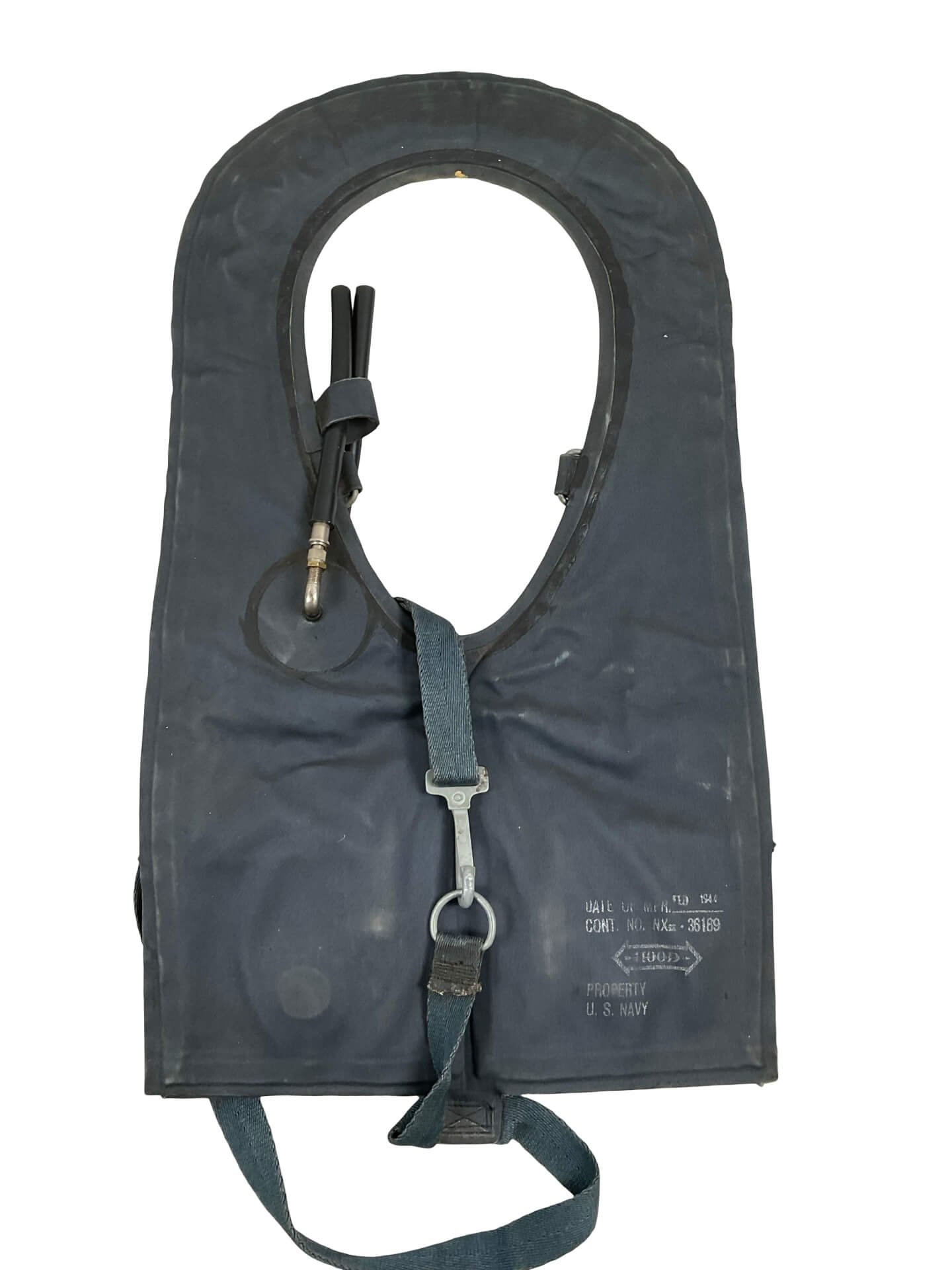 The WW2 US USN Navy Blue Mae West Dated 1944 is a personal flotation device used by United States Navy personnel during the Second World War. Commonly referred to as a “Mae West” after the Hollywood actress, this life preserver was standard issue for aviators and sailors. Constructed from durable blue cotton canvas, the vest features built-in flotation chambers designed to be inflated orally or via CO2 cartridges. Adjustable straps secure the vest to the wearer, providing buoyancy in emergency situations over water. The item is typically marked with USN insignia and often includes manufacturer stamps with date of issue; this example is dated 1944. The blue coloration distinguishes it from the yellow versions used by the US Army Air Forces. This vest represents a critical advancement in personal safety equipment developed during the war, reflecting both the technological and logistical responses to the demands of naval aviation and seaborne operations during this period.