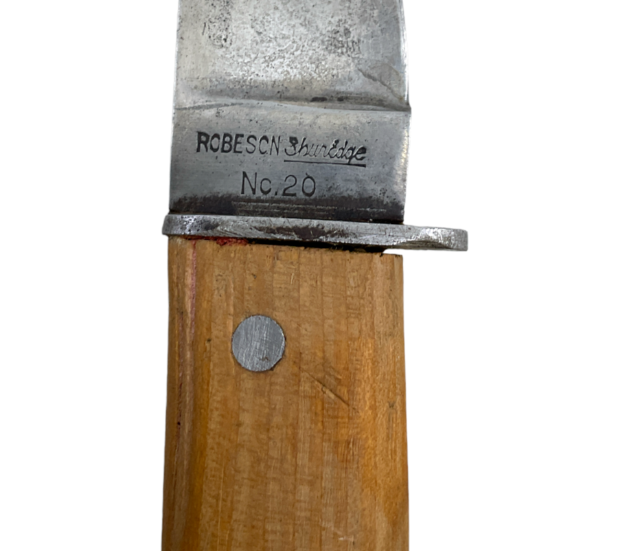 The WW2 US USN Navy Mk1 Shur Edge Robeson Fighting Knife is an iconic piece of military history. This combat knife was standard-issue for the United States Navy during World War II and is renowned for its robust design and reliability. Manufactured by Robeson, a company known for producing high-quality cutlery, the Mk1 features the distinctive “Shur Edge” blade, known for maintaining sharpness even under rigorous conditions. With a sturdy leather-wrapped handle for a secure grip and a durable sheath for safe storage, this knife was an essential tool for sailors and marines alike. Collectors and history enthusiasts alike prize this weapon not only for its functionality but also for its historical significance, symbolizing the bravery and resilience of the military personnel who wielded it during one of the most tumultuous periods in global history. The Mk1 Robeson Fighting Knife remains a sought-after artifact for its craftsmanship and its role in the war effort.