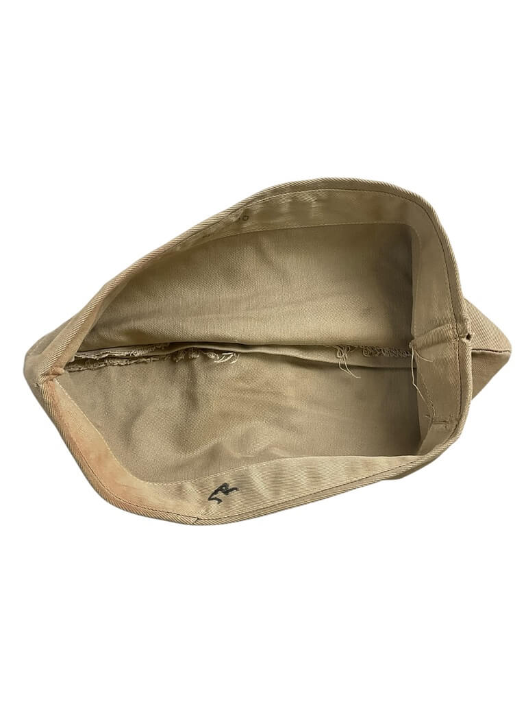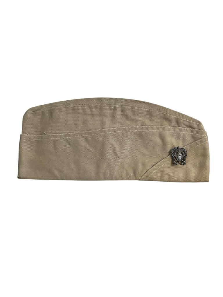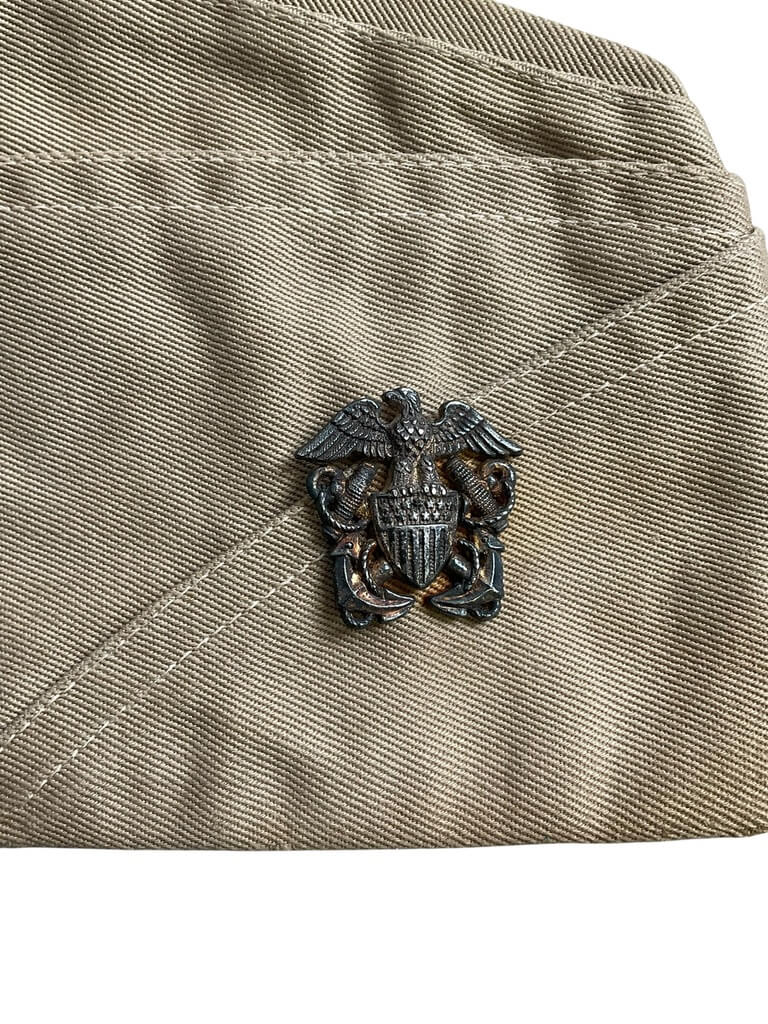 This item is a genuine WW2 US USN Navy Officers Overseas Cap, complete with original badge and distinct service number. Sized at 7 1/4, it serves as a remarkable piece of history, once worn by the brave officers who served in the United States Navy during World War II. The badge attached to the cap symbolizes the rank and status of the wearer, adding to the authenticity and historical significance of this item. This cap is not just a piece of military memorabilia, but a tangible connection to the past, a symbol of courage, duty, and national service. The service number further establishes its authenticity, tracing back to the original officer who donned this cap. Enjoy owning a piece of American history with this WW2 US USN Navy Officers Overseas Cap.