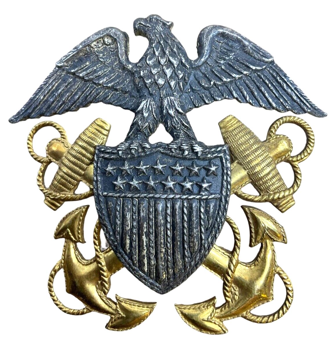 This historically significant WW2 US USN Navy Officers Screw Back Visor Cap Insignia is a remarkable collectible for enthusiasts and historians alike. Crafted by Vanguard, the insignia is a symbol of the distinguished service of Navy officers during World War II. Made with meticulous attention to detail, it is 1/10 gold-filled, ensuring both durability and a lasting shine. The screw-back design secures the insignia firmly in place on the officer’s visor cap, showcasing an era-specific attachment method. This piece is not only a tribute to the brave individuals who served in the United States Navy but also an exquisite example of wartime craftsmanship. Whether you are a collector of military memorabilia or someone with a profound interest in naval history, this insignia provides a tangible connection to the valor and commitment exhibited during one of the most pivotal periods in global history.