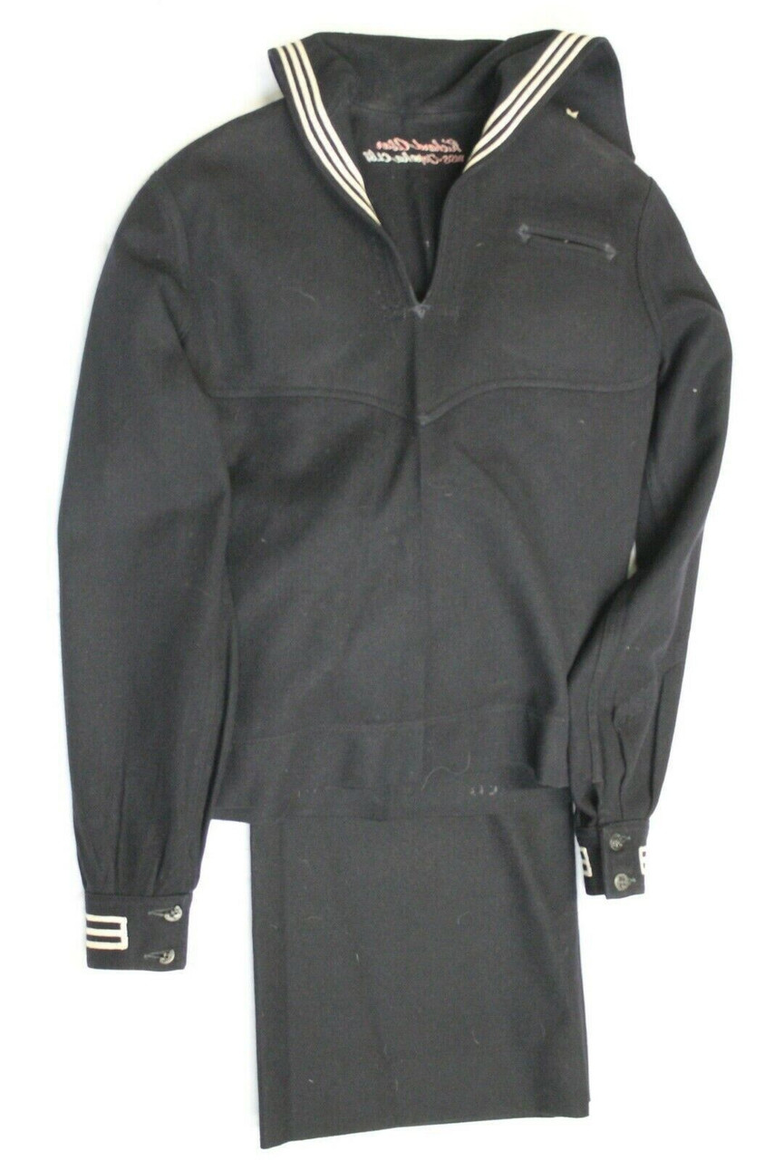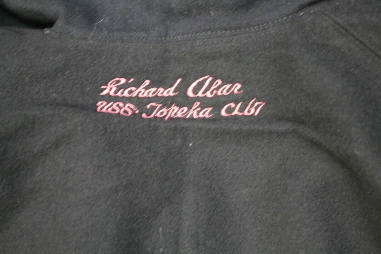 A used WW2 USN Navy Jumper with Trousers Named USS Topeka, Small jumper, pants apx 30 inch waist, long leg, excellent condition both top and pants.