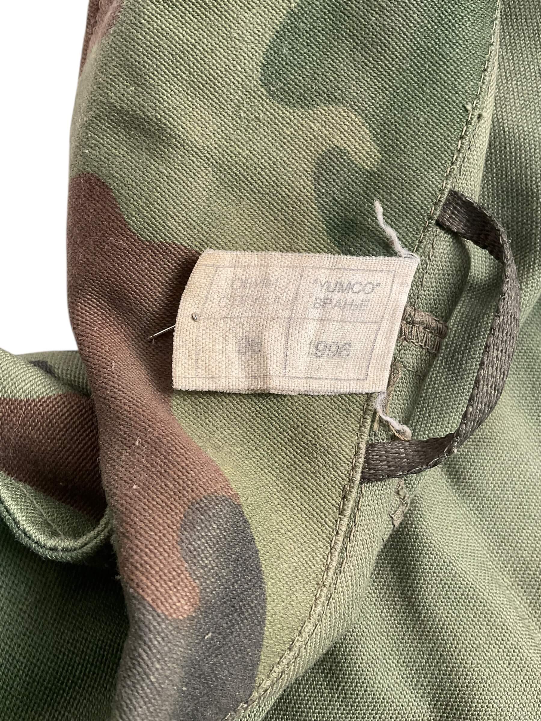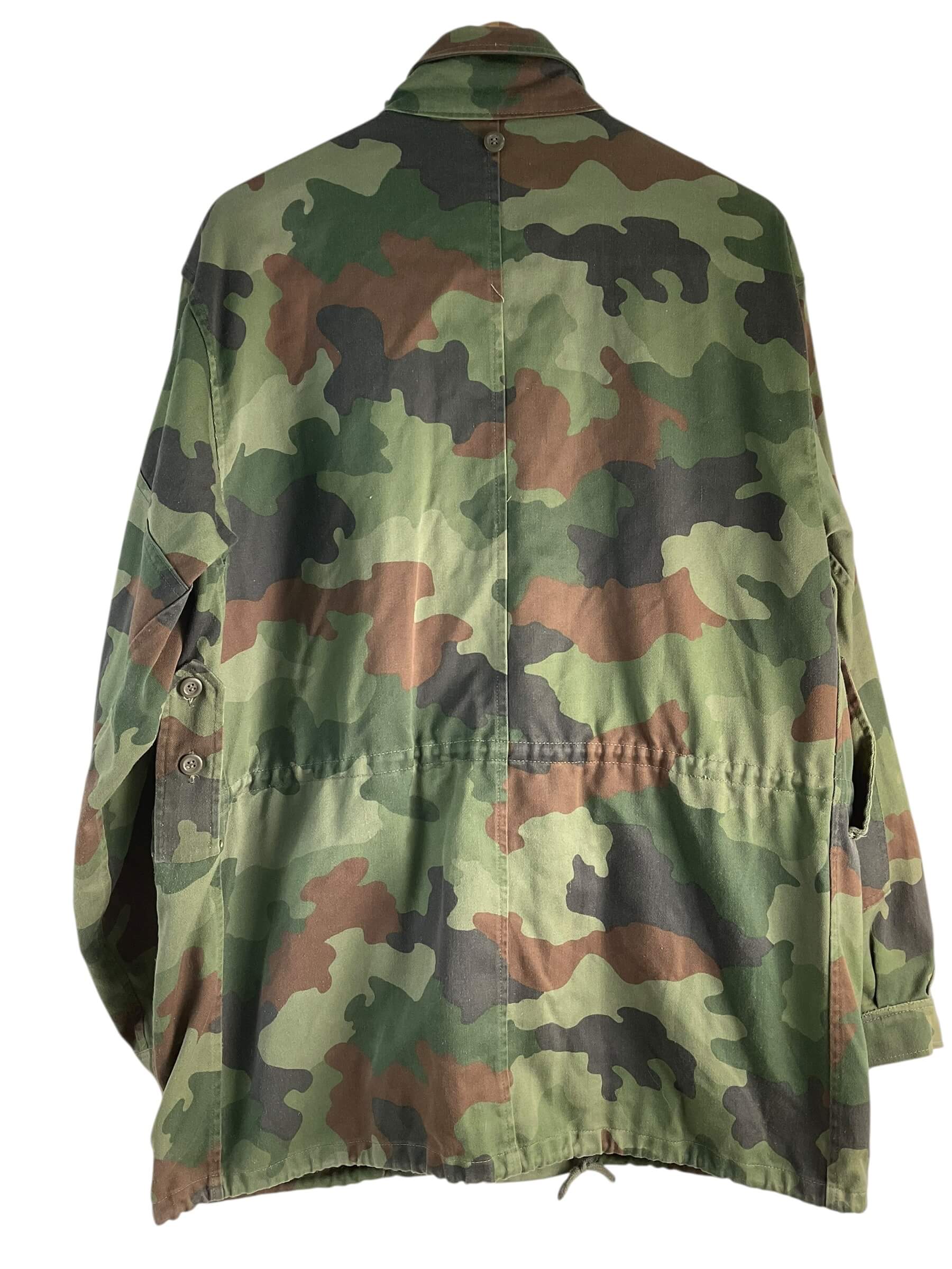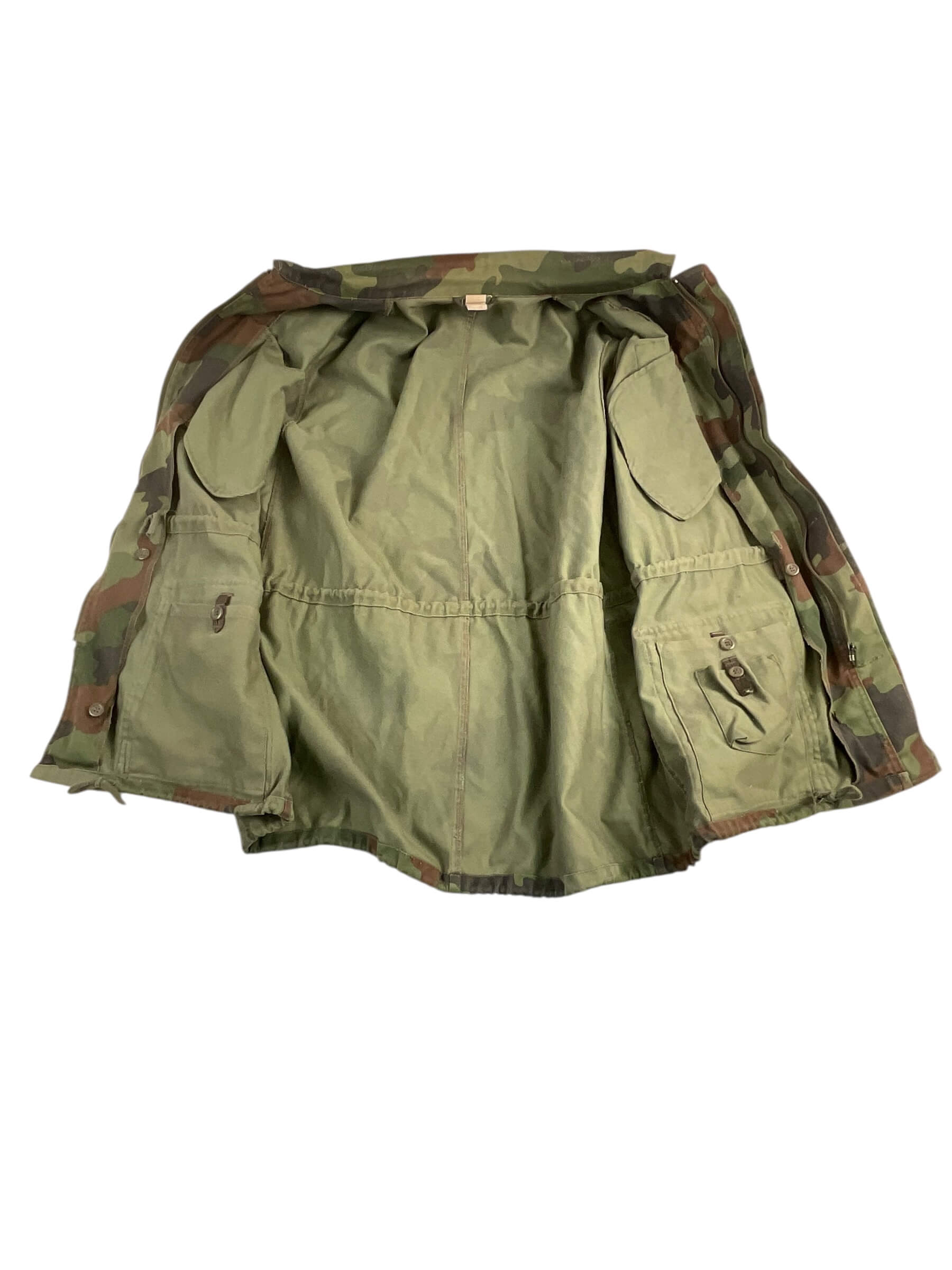 The Yugoslavian Army Camouflage Jacket is a standard-issue military garment originating from the former Socialist Federal Republic of Yugoslavia. Produced primarily during the late 20th century, this jacket was designed for use by various branches of the Yugoslav armed forces. It typically features a woodland camouflage pattern, tailored to the diverse terrains found in the region, and was constructed from durable cotton or polyester-blend fabric suitable for extended field use. Standard elements include a button or zip front closure, adjustable cuffs, and multiple pockets for carrying essential items. The jacket’s design reflects utilitarian military requirements, focusing on both camouflage effectiveness and practicality. Shoulder epaulets, reinforced elbow patches, and internal labels with issue information are common characteristics. Yugoslavian Army Camouflage Jackets are representative of Cold War-era military uniforms and are sought by collectors for their historical relevance and distinctive regional patterning.